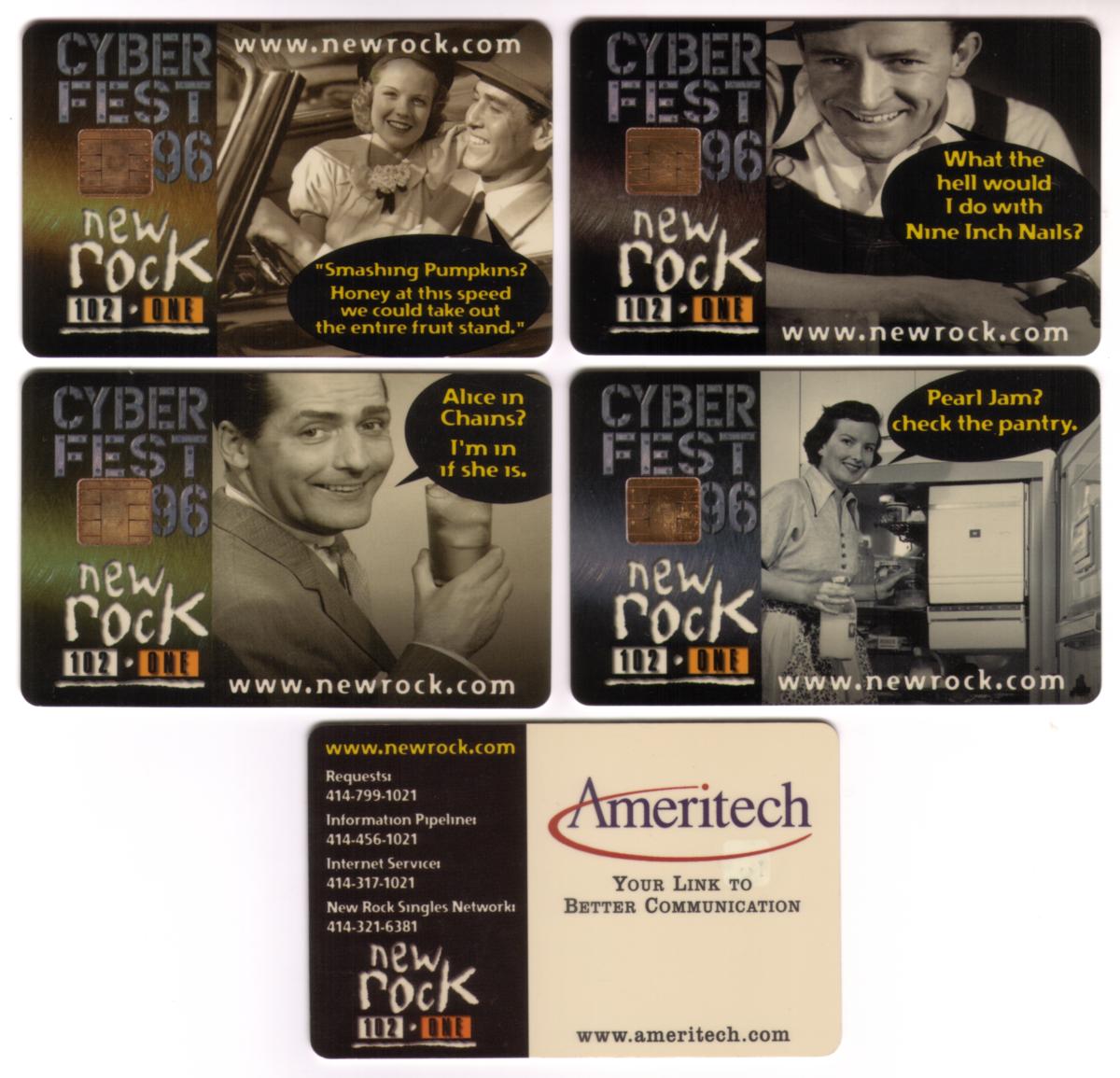 These cards were released in 1996 and serve as collectible memorabilia that highlight both the popular alternative rock scene of the time and the role of Ameritech in telecommunications promotions. Each card is part of a four-piece set celebrating CyberFest '96, with the design and branding firmly rooted in mid-1990s music and regional radio culture.