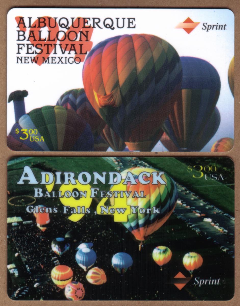 This collectible phone card set features two distinct designs celebrating hot air balloon festivals held in New York and New Mexico in 1994. The first card highlights the Adirondack Balloon Festival in Glens Falls, New York. It prominently showcases colorful hot air balloons rising into a clear sky, capturing the spirit of this well-known ballooning event. The second card commemorates the Albuquerque International Balloon Fiesta in New Mexico, featuring vivid imagery of multiple hot air balloons against a bright sky, representing one of the largest balloon festivals in the United States.