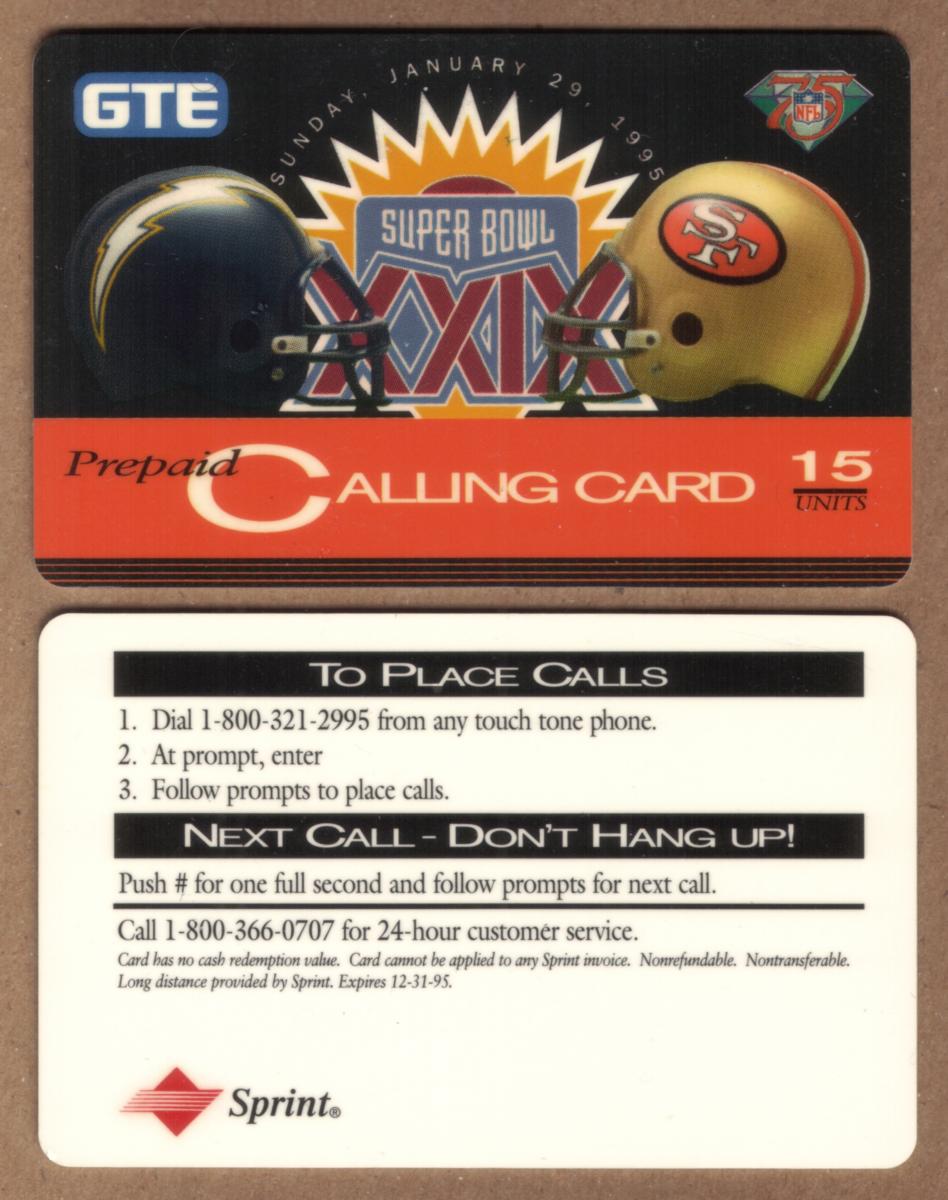 This collectible phone card commemorates Super Bowl XXIX, featuring the helmets of the San Francisco 49ers and the San Diego Chargers. The card celebrates NFL football games and the NFL’s 75 years of history. The main visual includes two football helmets facing each other: one representing the San Francisco 49ers with their distinctive red and gold colors and the other representing the San Diego Chargers with their blue and gold lightning bolt design. The helmets are detailed and prominently displayed in the center of the card.