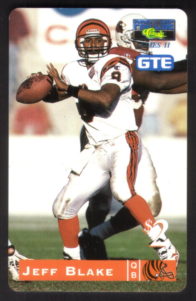 This collectible phone card features Jeff Blake, quarterback (QB) for the Cincinnati Bengals in the National Football League (NFL). The image captures Blake in action, poised to throw a football, wearing a white Bengals uniform accented with orange and black stripes. His orange helmet features the Bengals' tiger-stripe pattern, matching his socks and the helmet icon displayed next to his name.