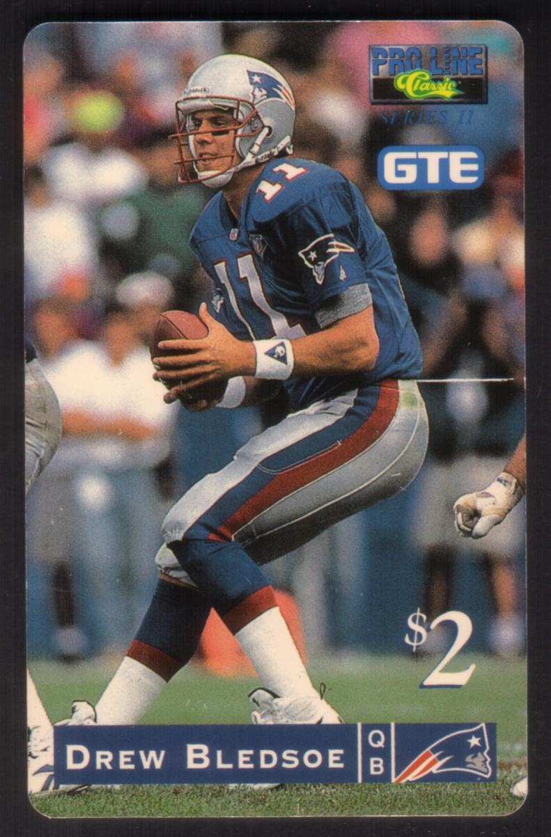 This collectible phone card features Drew Bledsoe, quarterback for the New England Patriots in the National Football League (NFL). Bledsoe is shown in full uniform, wearing a blue jersey with the number 11 and the Patriots logo on his helmet and sleeve. Positioned in a throwing stance, he holds a football, ready to make a play on the field. His white helmet displays the Patriots emblem clearly.