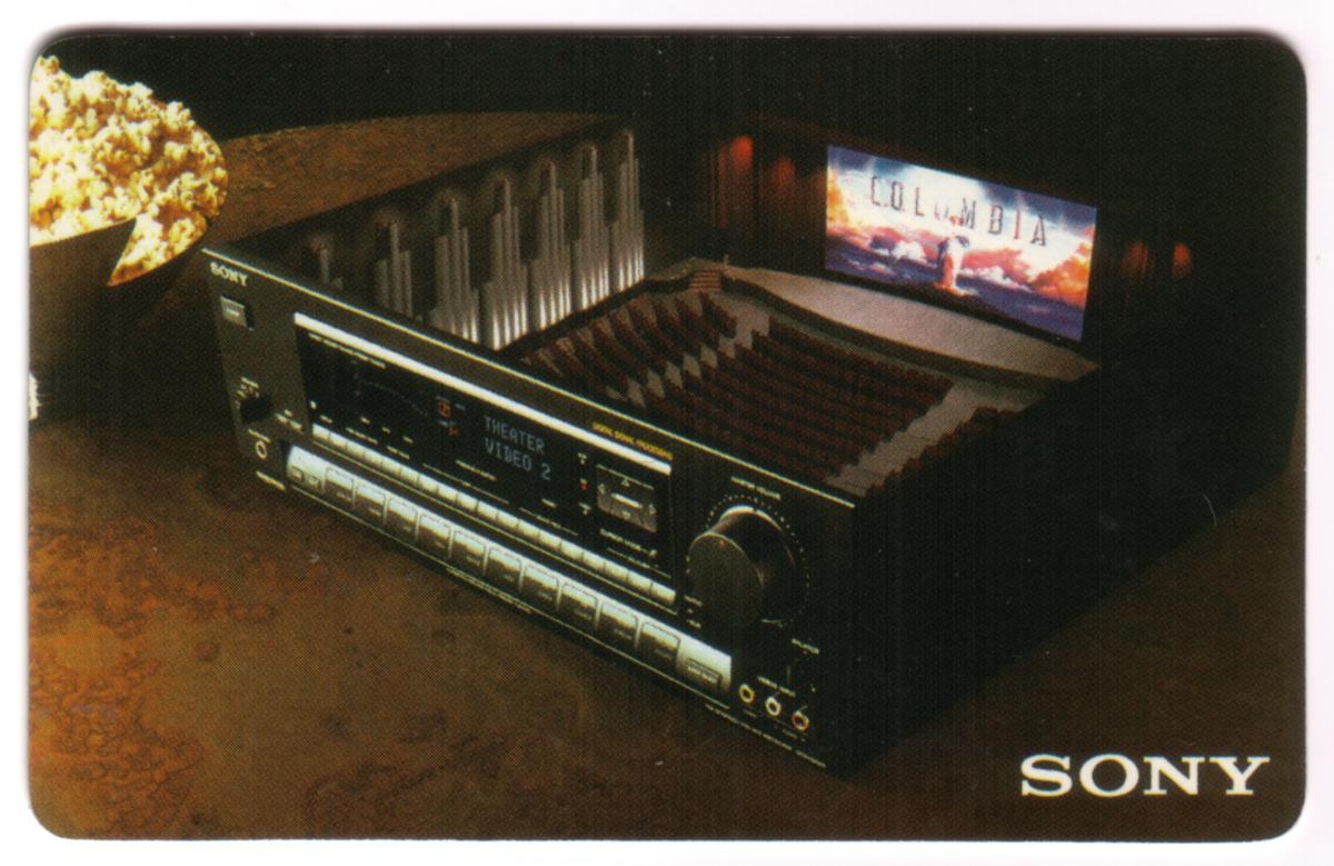 Overall, the card combines corporate branding with promotional messaging, making it a collectible item that centers on the theme of advanced home theater audio technology by Sony, distributed through telephone express and associated with PATCO.