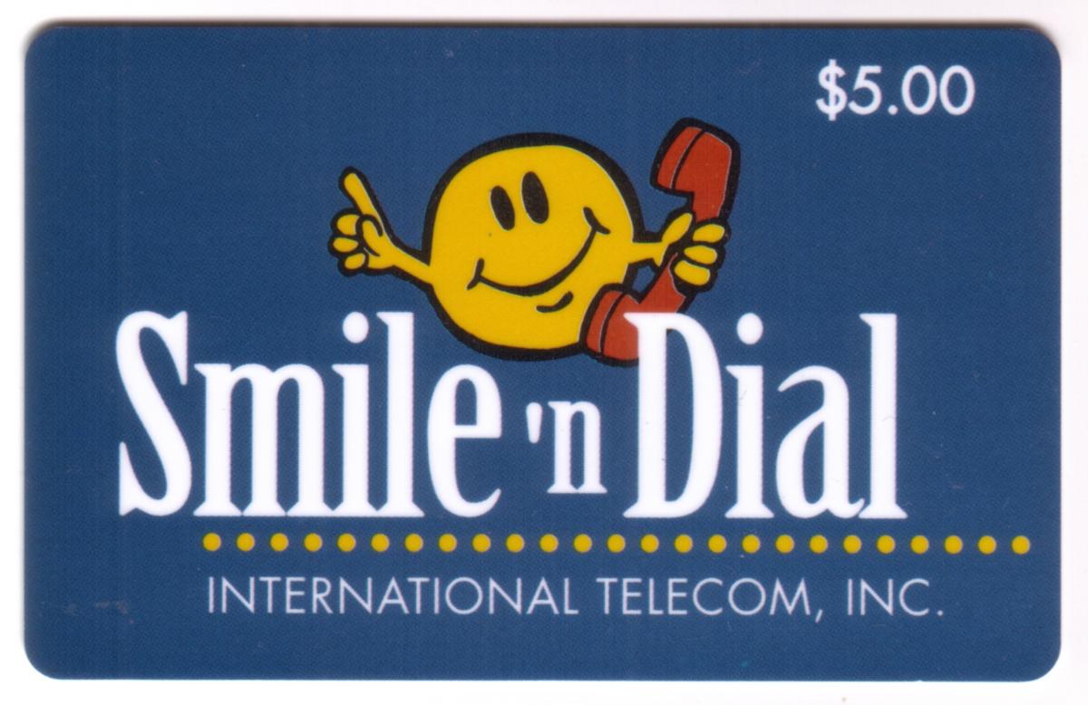 At the top left of the card, “SMILE ‘N DIAL” is printed in bold yellow capital letters, aligned horizontally. Beneath the main smiley face graphic, there is a pale blue rectangular area that displays the value of the card, marked as “$5” in white text. Above this value box, the word “INTERNATIONAL TELECOM” appears in small white capital letters spanning the card’s width.