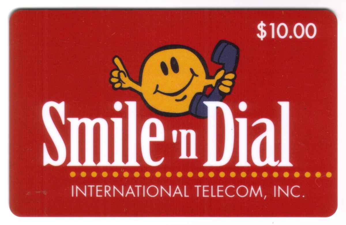 Below the character, "Smile 'n Dial" is prominently printed in large white letters with a dotted yellow line underneath. Beneath this line, the text "INTERNATIONAL TELECOM, INC." appears in smaller white capitals. The card's value, "$10.00," is displayed in white in the upper right corner.