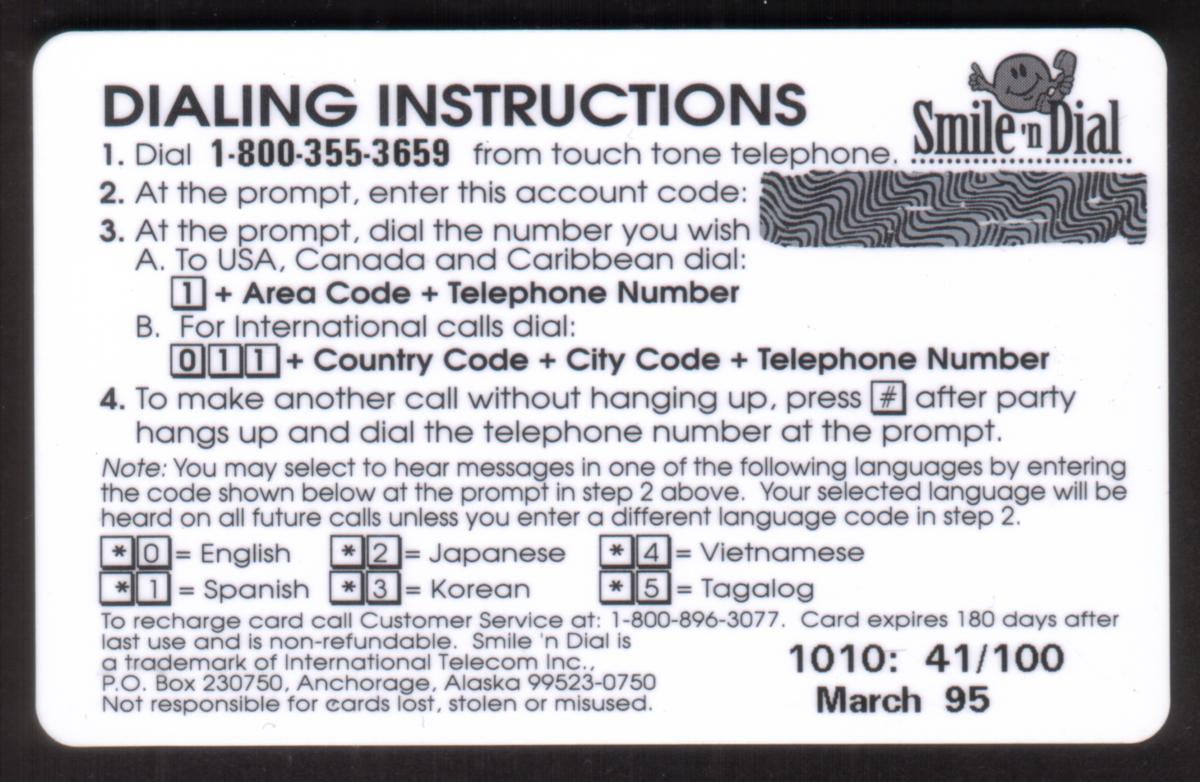 This card is associated with Alaska and is part of a prototype series for Smile 'n Dial Red Happy Face With Handset Logo Remote by International Telecom. The clear, bold design emphasizes the cheerful smiley icon and telephone imagery consistent with the phone card's purpose.
