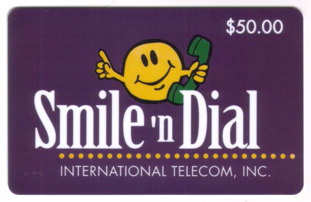 In the top right corner of the card, the value "$50.00" is printed in white, indicating the card’s monetary denomination. The overall design uses a combination of bright colors and a cartoon style to create a cheerful and inviting look. The card is associated with Smile ‘n Dial and International Telecom, Inc., and it originates from Alaska as indicated by the related keywords.