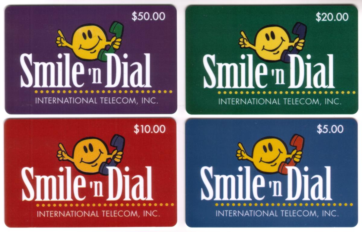 This collectible phone card set features four prototype cards from Int’l Telecom (Alaska) branded as Smile ’n Dial. Each card displays a colorful cartoon design of telephones, highlighting a happy face logo prominently integrated into the artwork. The images showcase different phone illustrations, maintaining a cheerful and playful theme consistent with the Smile ’n Dial branding. The cards represent denominations of $5, $10, $20, and $50, clearly marked on each respective card.
