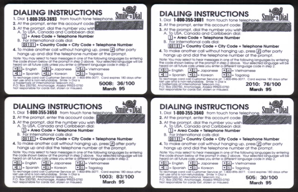 The cards’ front designs combine bright colors and stylized cartoon elements centered around telephones, reinforcing the connection to calling and telecom services. The “Smile ’n Dial Happy Face Logo Remote Set of 4 PROTOTYPE” is specifically identified as an international telecommunication collectible from Alaska, emphasizing its origin and theme. The Int’l Telecom (Alaska) name is visible, confirming the set’s official association with this company.