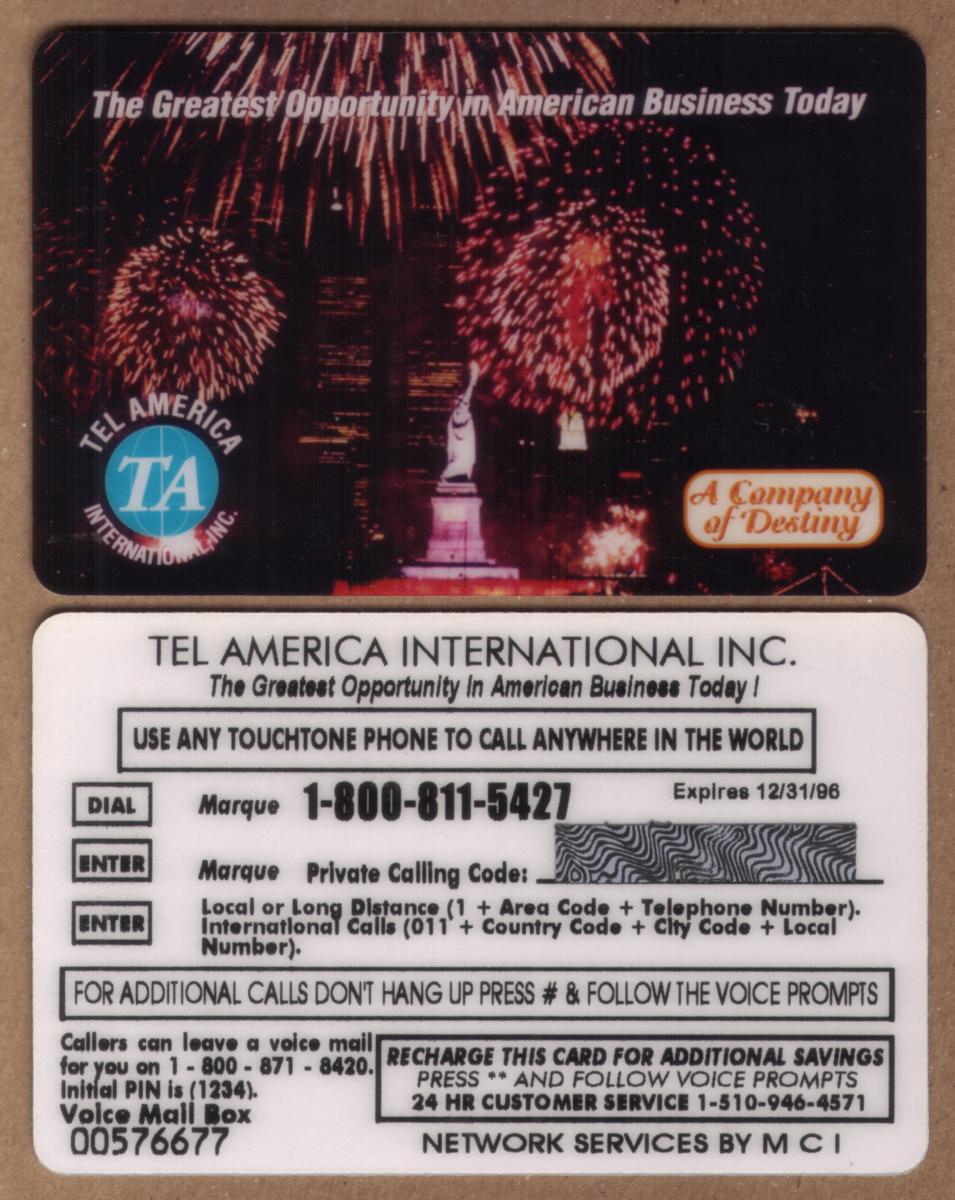 The card includes multiple logos and company names printed on its surface. Notable mentions are "Tel America," "Destiny Telecomm International," and "MCI," linking the card to major telecommunications companies. The text references "The Greatest Opportunity in American Business Today," aligning the card with commercial or promotional telecommunications messaging. The card is described as rechargeable and featuring voicemail, emphasizing its functionality beyond simple usage.