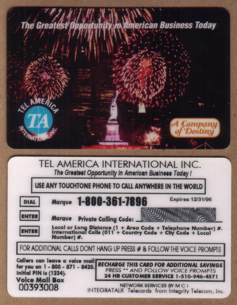 Text elements on the card identify its association with Destiny Telecomm International and Tel America. The card includes the phrases "Tel America Fireworks & Statue of Liberty Voice Mail & IntegraTalk - Destiny Telecomm TA," emphasizing its connection to telecommunications services. Additional wording on the card refers to concepts such as "integrity telecom" and "the greatest opportunity in American business today," reinforcing a theme of trust and opportunity within the American business landscape.