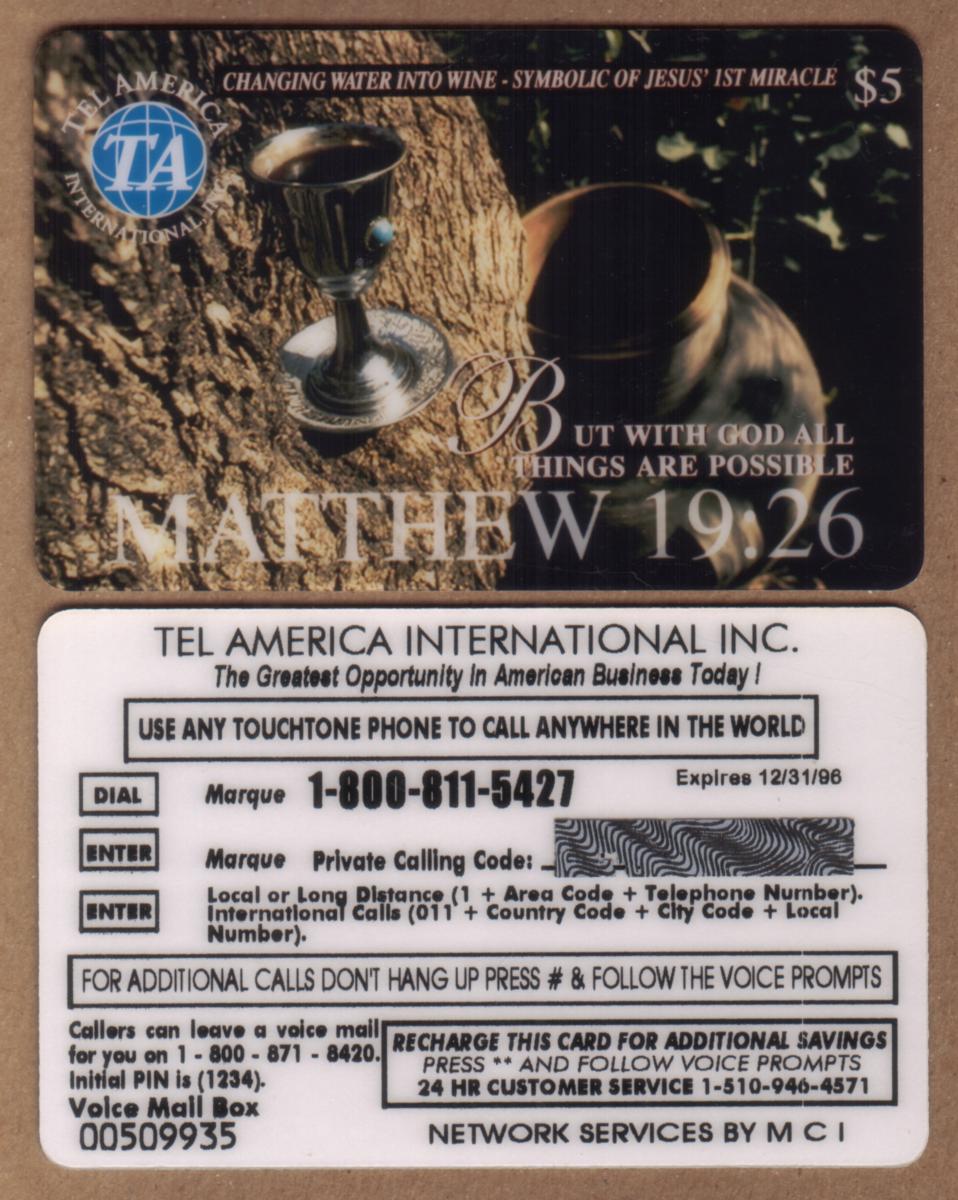 The textual content of the card is straightforward: it includes the Bible verse citation Matthew 19:26, the inspirational phrase "With God All Things Are Possible," and the phrase "changing water into wine," which directly references Jesus’ first miracle. The words “bible,” “religious,” and “christian religion” from the keywords align with the themes portrayed by the text. The card is presented as a collectible phone card carrying a faith-based message while also representing Telamerica’s involvement in telecommunication services.