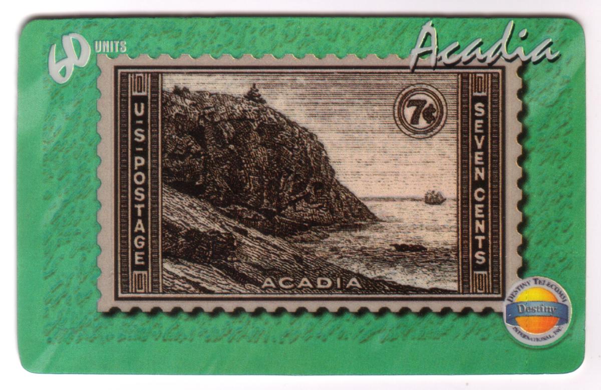 The card includes text identifying it as part of a 7-cent postage stamp series. The words "Acadia National Park" are clearly visible, confirming the location portrayed. The card also carries the label "PROOF," indicating it is a proof print of the stamp design. The name "Destiny Telecomm" appears here, associated with the card’s production.