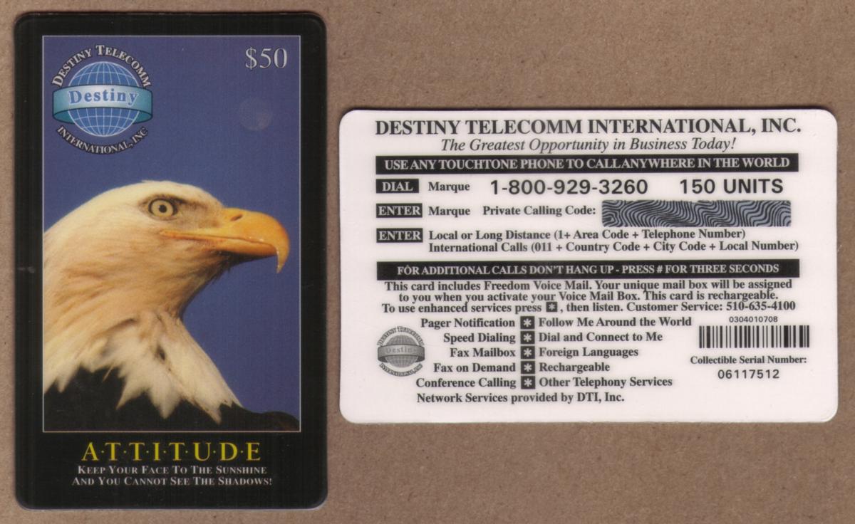 Overall, this is a collectible phone card from the Destiny Telecomm motivational series, celebrating one of America’s most recognized national birds, the bald eagle, and embodying American pride and heritage.