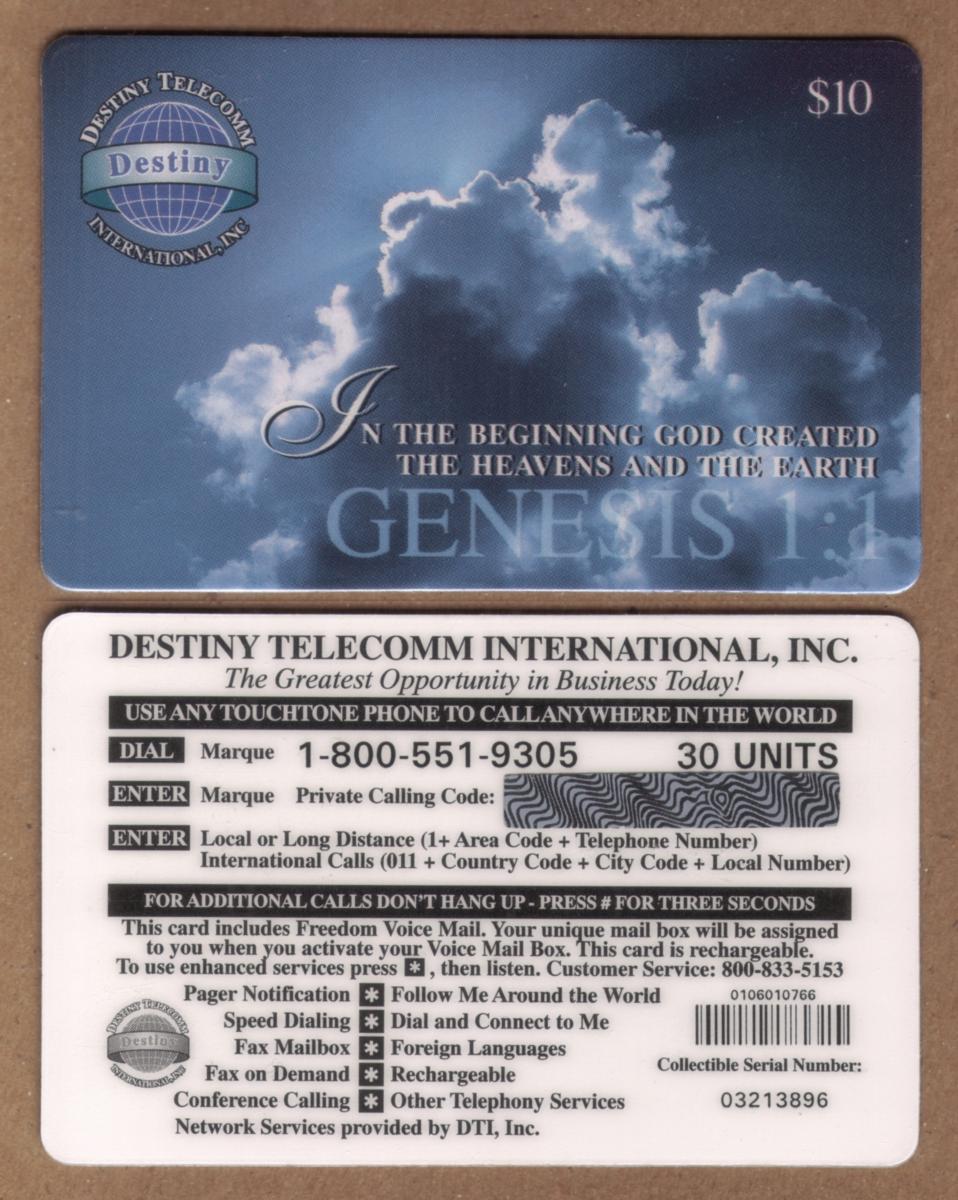 This phone card represents elements of Christian faith and religious belief, focusing on the foundational moment described in the Bible. The combination of scripture and the name Destiny Telecomm connects the collectible to a specific series within the category of religious-themed phone cards.