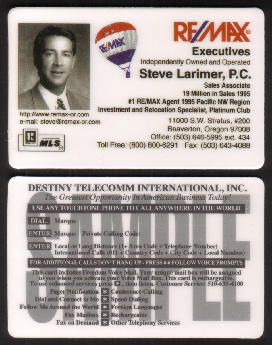 This collectible card is a corporate business card for Steve Karimer, a Sales Associate at Re/Max Realty located in Beaverton, Oregon. The card prominently features the Re/Max logo along with the MLS logo, highlighting its connection to real estate services and listings. It includes the designation “1995 Pacific NW Region,” indicating a specific time and geographic focus. The card also mentions Steve Karimer’s status as an Investment and Relocation Specialist and membership in the Platinum Club.