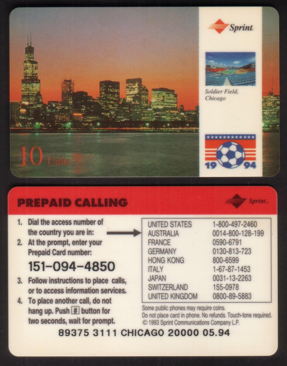 The design incorporates visual references to international soccer, with the mention of “10u Soccer Int’l” indicating a youth or international connection to the sport. The card also prominently features the Sprint logo, identifying the telecommunications company linked with the card’s service or sponsorship. The graphics and text are arranged in a way that emphasizes the sporting event, location, and date, confirming its association with the World Cup event held in Chicago during 1994.