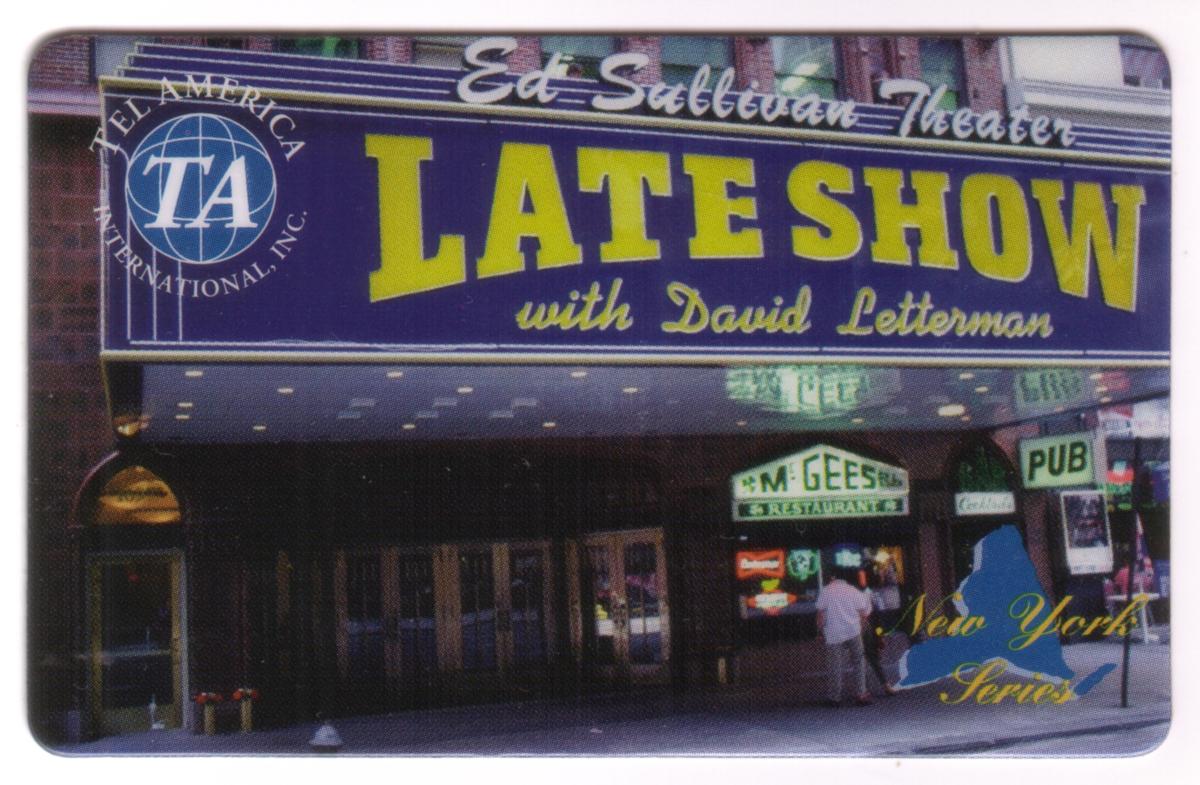 This collectible phone card features a vibrant photographic image of the Ed Sullivan Theater marquee advertising "LATE SHOW with David Letterman." The marquee displays the show's title in large yellow letters on a blue background, with "Ed Sullivan Theater" written in cursive white lettering above. The image captures the front entrance of the theater, including doors and surrounding facade details.