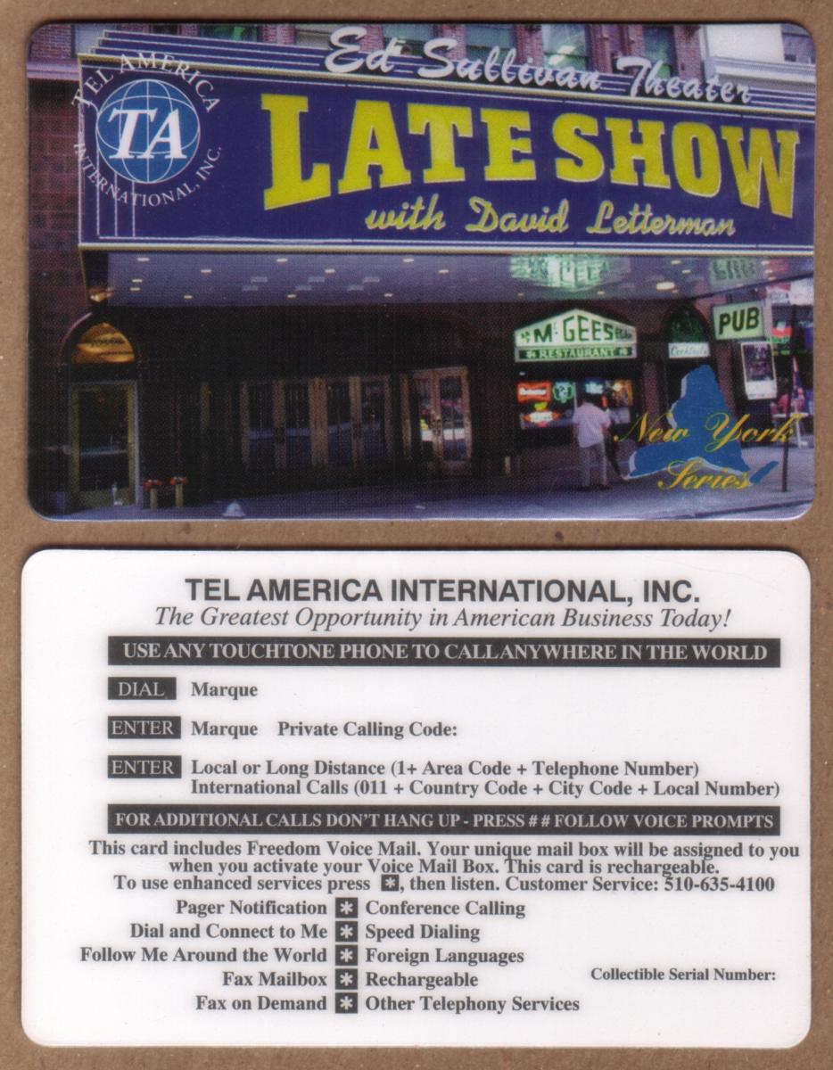 This collectible card serves as a unique artifact linking the famed Late Show taping location with its surrounding cultural landmarks and the telecommunications companies involved in its distribution. Its focus on the Ed Sullivan Theater, McGee's venues, and Telamerica makes it a notable card for collectors interested in television history and vintage telecommunication memorabilia.