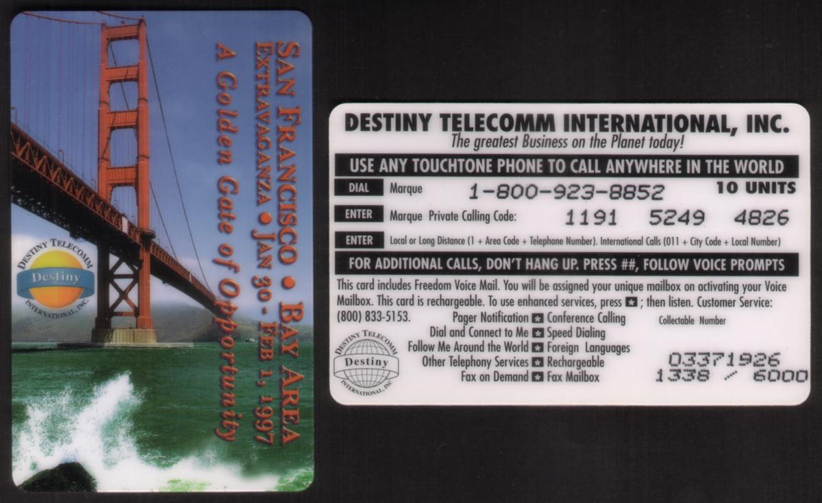 This collectible phone card from Destiny Telecomm features a vertical photographic image of the Golden Gate Bridge in San Francisco, California. The iconic red-orange suspension bridge spans across the bay with its two main towers prominently rising above the water. The bridge connects the cityscape of San Francisco on one side with surrounding areas visible in the background. The waters of the bay reflect the clear, blue sky, contributing to the scenic quality of the image.