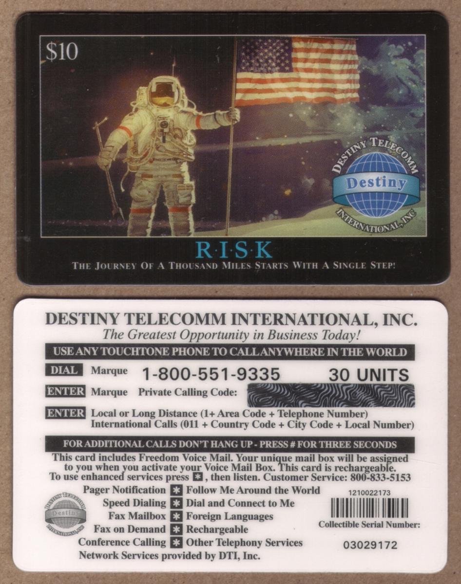 The card includes text elements clearly identifying it as part of the “American historical landmarks” and “American history” themes. It is associated with the “motivational series” and references space travel and the iconic phrase, “The journey of a thousand miles starts with a single step.” The denomination of the card is $10, and the brand name “Destiny Telecomm” appears on the card, indicating the issuing telecommunications company.
