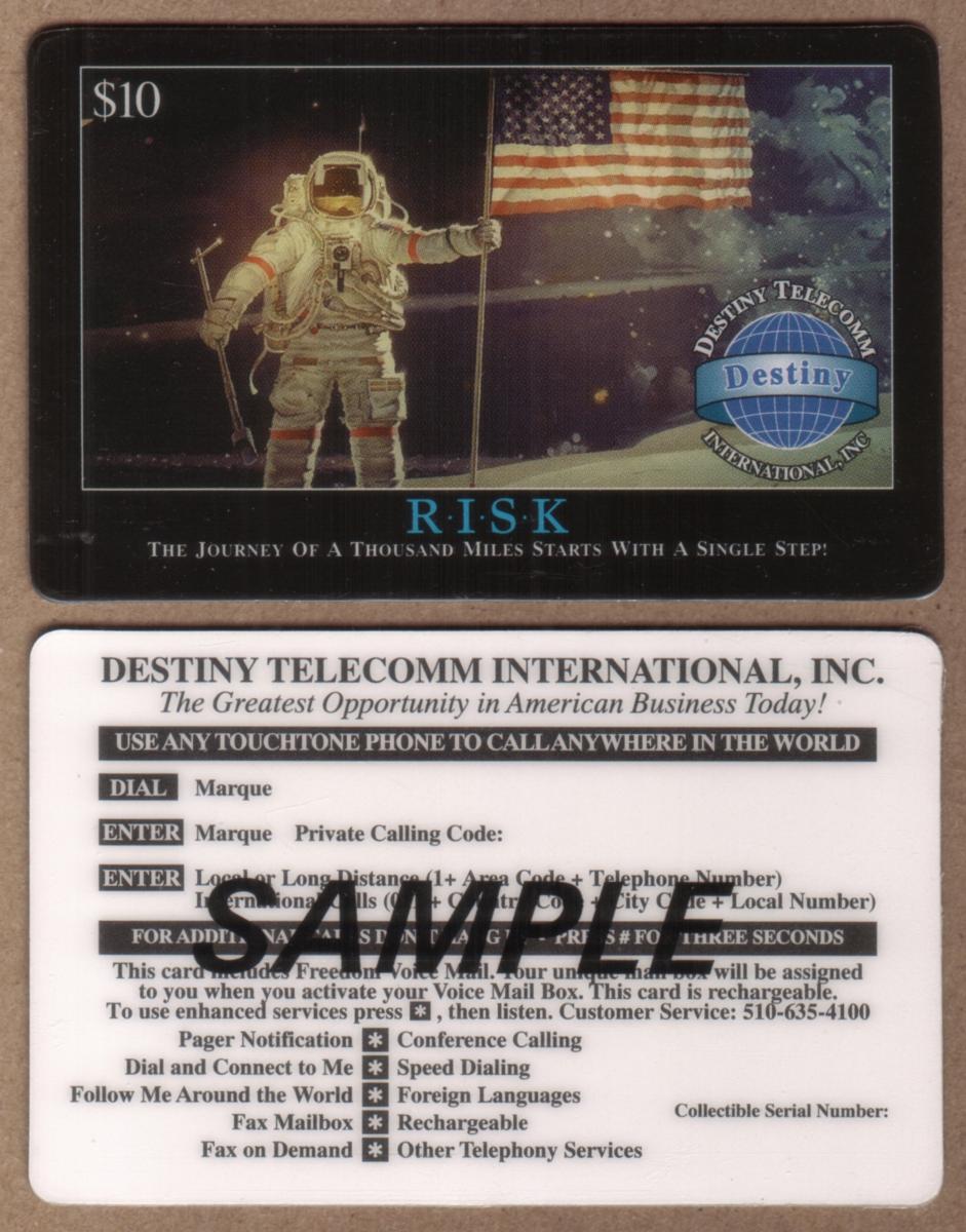 At the top right corner, the denomination "$10" is clearly printed. Along the bottom left, the word "Risk" is displayed, and towards the lower right corner, the phrase "The journey of a thousand miles starts with a single step" appears, highlighting a motivational message associated with the card. The telecommunications company Destiny Telecomm is mentioned in association with the card.