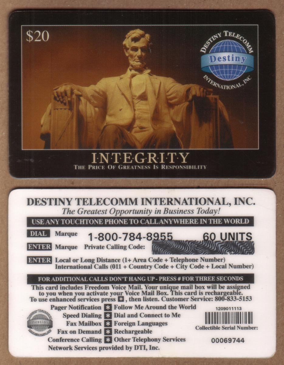 The card includes the word "Integrity" alongside the title "Lincoln Memorial Monument," reinforcing the theme of moral excellence associated with Abraham Lincoln’s legacy. The Destiny Telecomm logo appears on the card, indicating the telecommunications company involved with the issuance or sponsorship of this collectible item. The card’s face value is $20.