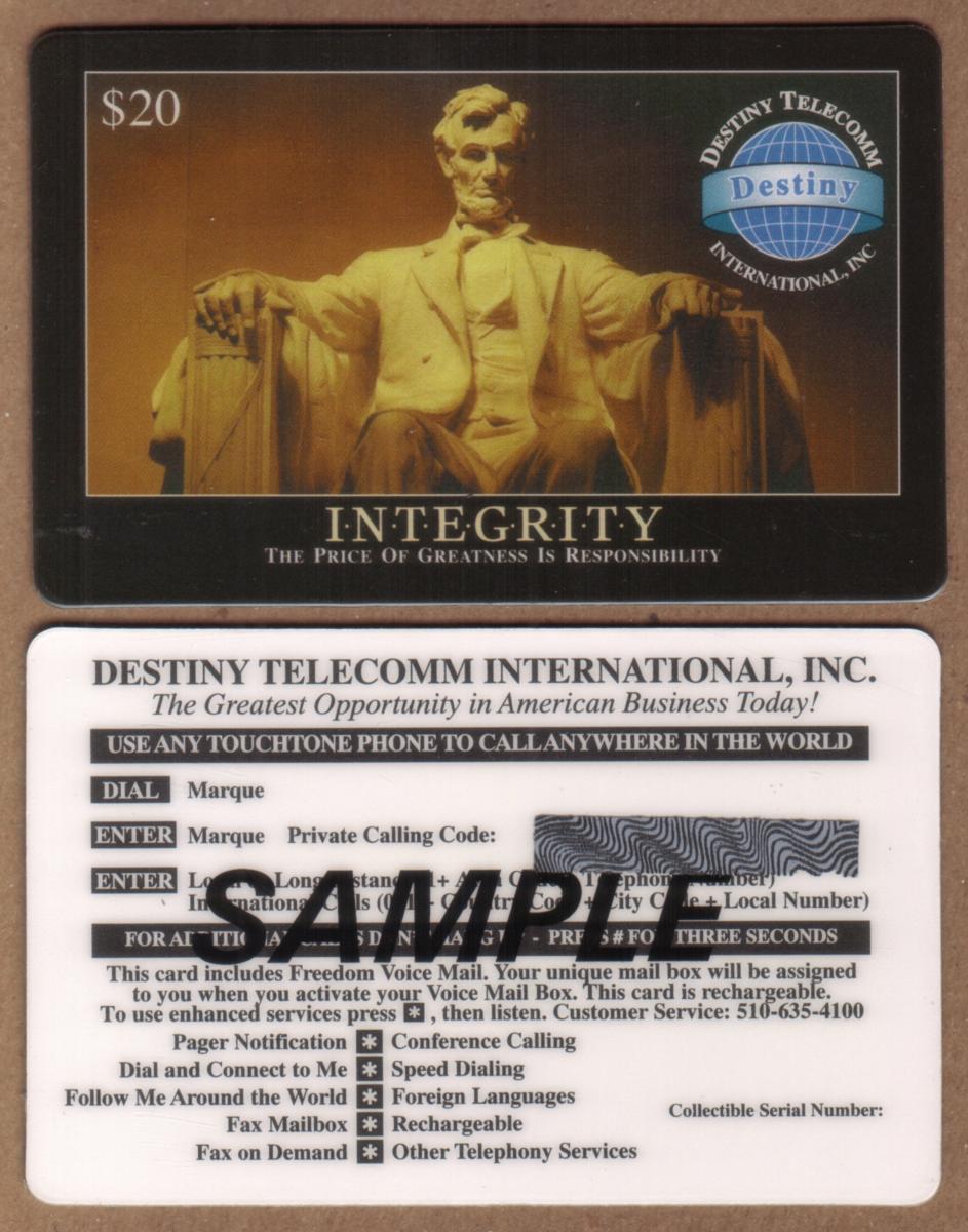 Text on the card includes the phrase "Integrity - Lincoln Memorial Monument" and "$20," indicating its value. The card also displays the name "Destiny Telecomm," the telecommunications company issuing the collectible. Additional wording present on the card is "WorldCom," referencing the telecommunications entity associated with the card’s issuance. The overall design is focused on Americana and American history, with an emphasis on patriotic symbolism linked to the legacy of Abraham Lincoln.