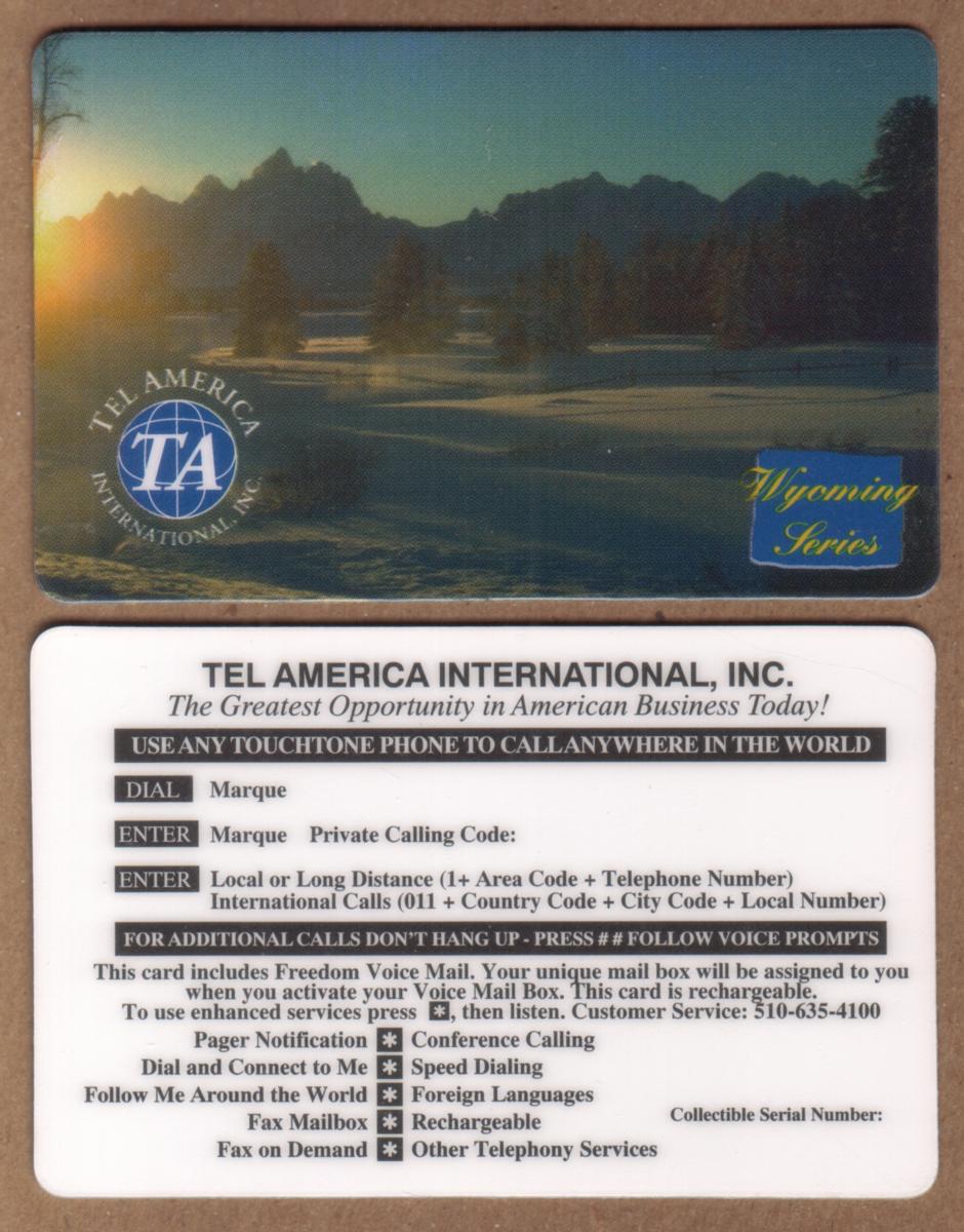 The card is part of the Tel America American States Series, specifically labeled "Tel America Early Morning In Wyoming." The Destiny Telecomm TA logo is displayed prominently. The overall design evokes Americana and travel themes, emphasizing sightseeing within a distinctive natural environment in the United States. The word "Specimen" appears on the card, signifying its status as a sample or collector’s item.