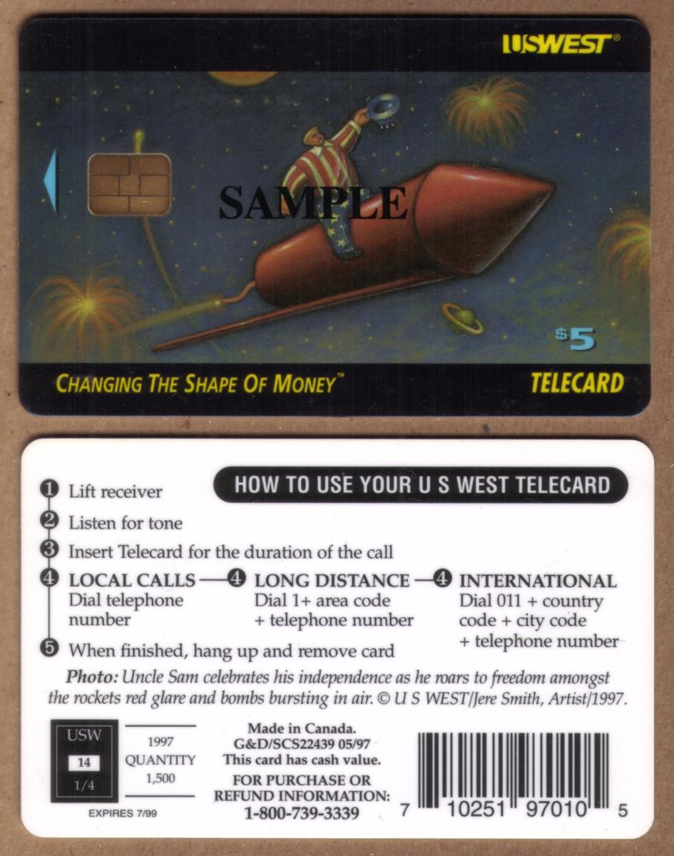 This promotional chip card is a sample collectible piece reflecting the holiday theme with a balance of text and classic Americana symbols. The combination of fireworks, Uncle Sam, and historical references in the artwork by Jere Smith make it a distinctive example of holiday-themed promotional stored value cards issued by U.S. West Communications.