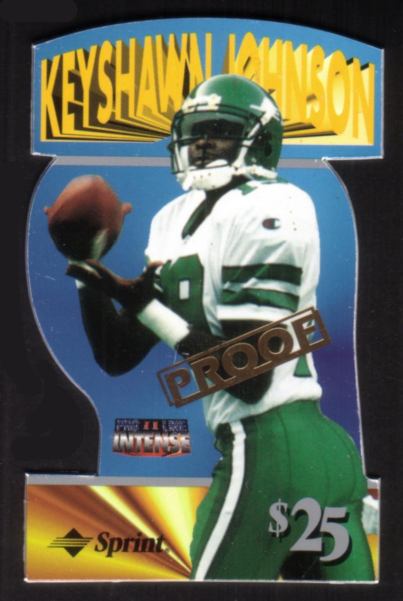 At the top of the card, "KEYSHAWN JOHNSON" is prominently displayed in large, yellow, stylized uppercase letters. In the lower center portion, there is a black "PROOF" stamp over the player's image. Below that, towards the bottom left, a small logo reads "Proline Intense," with the word "INTENSE" emphasized. A gold and orange gradient band occupies the bottom section, featuring the Sprint logo on the left and a bold "$25" value on the right.