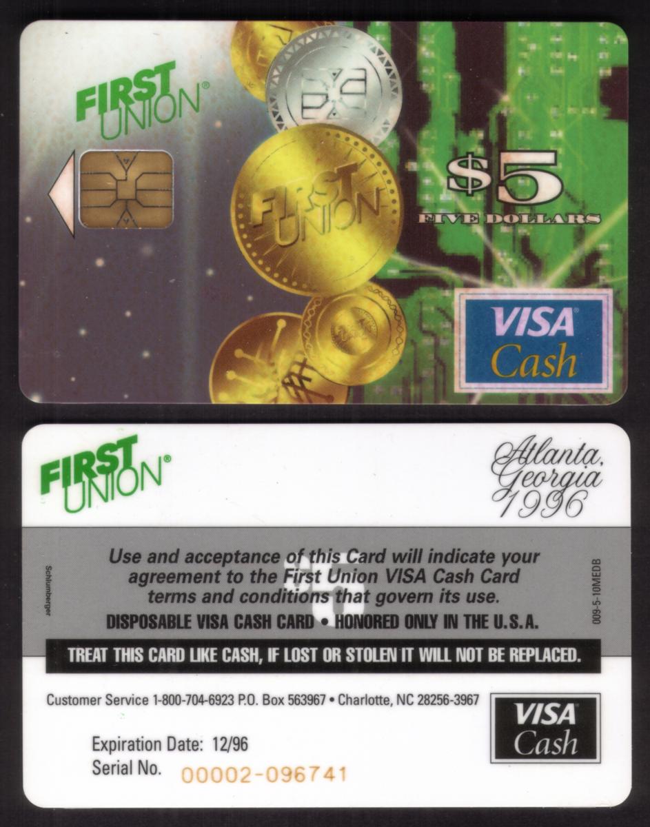 The card's layout incorporates the VISA Cash logo, confirming its classification as a Visa Cash Card. The First Union Corp. Bank’s branding is visible, anchoring the card’s origin to this financial institution. The overall design is clean, with a modern aesthetic from the mid-1990s, featuring metallic effects that highlight its value-related function and collectible nature.