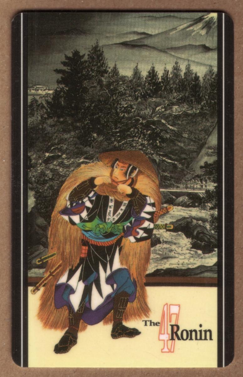 This collectible card features an artistic depiction related to the legend of the 47 Ronin. A samurai warrior dressed in traditional Bushido attire stands prominently in the foreground. The warrior wears a detailed outfit showcasing bold geometric patterns in black, white, blue, and green, with traditional armor elements and a cloak made of straw or similar material draped over the shoulders. The samurai's posture is reflective, with crossed arms and a solemn expression.