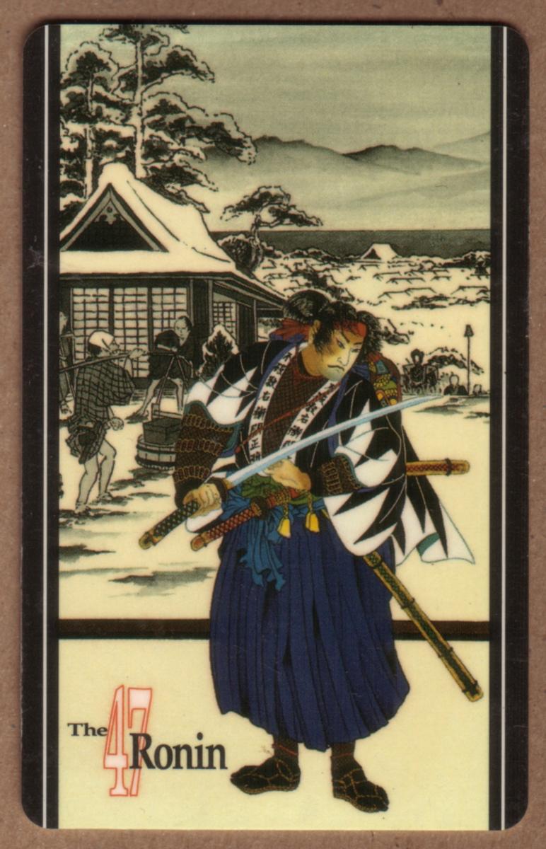 The front of the card prominently displays a samurai warrior wearing traditional armor and a helmet without any visible numbers or markings. The samurai's fierce expression and detailed attire highlight the essence of bushido, the samurai code of honor. The background includes stylized elements that evoke the period setting, with strong lines and shading emphasizing movement and intensity.