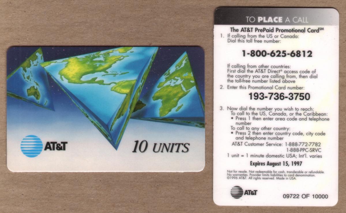 Overall, the card combines an artistic representation of the Earth with corporate branding for AT&T’s prepaid calling service. The design’s distinctive use of the triangle shape for the world map visually supports its purpose as a promotional marketing item from 1997.