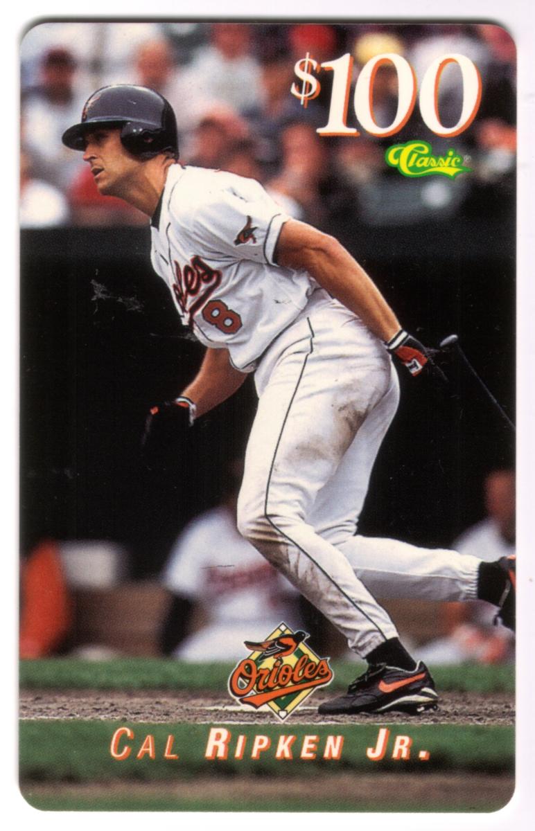 In the upper right corner, the card displays a $100 denomination alongside the word "Classic" in green and yellow script. Near the bottom center, the Baltimore Orioles logo is prominently placed above the name "Cal Ripken Jr." printed in uppercase orange letters with a white outline.