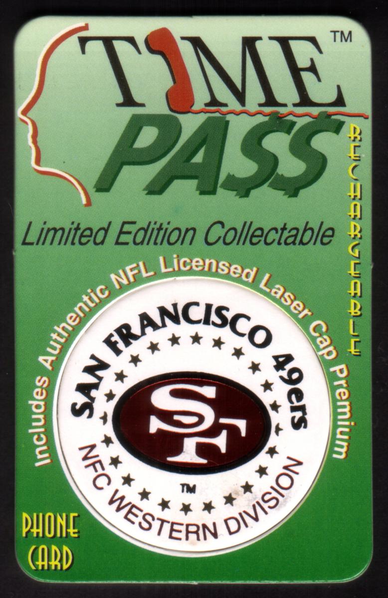 Above the helmet image, the text "Time Pass With San Francisco 49ers Football" is displayed in black. The collectible is NFL licensed, indicated by the official NFL logo printed near the bottom right corner of the card. The card also includes branding from Access Telecom and IGN, showing its association with these companies.
