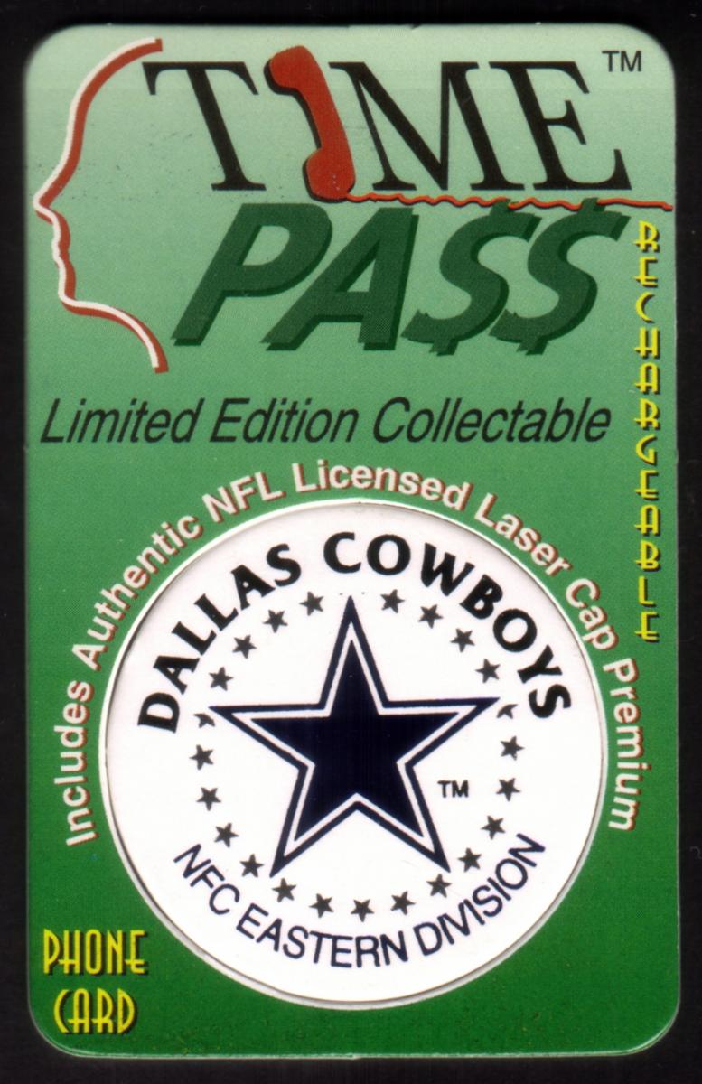 This is a collectible phone card titled "Time Pass" featuring the Dallas Cowboys NFL team. The card prominently displays the official Dallas Cowboys logo, a blue star surrounded by a circle of smaller stars. Surrounding the logo are the words "DALLAS COWBOYS" above and "NFC EASTERN DIVISION" below, confirming its affiliation with the NFC Eastern Division of the National Football League.