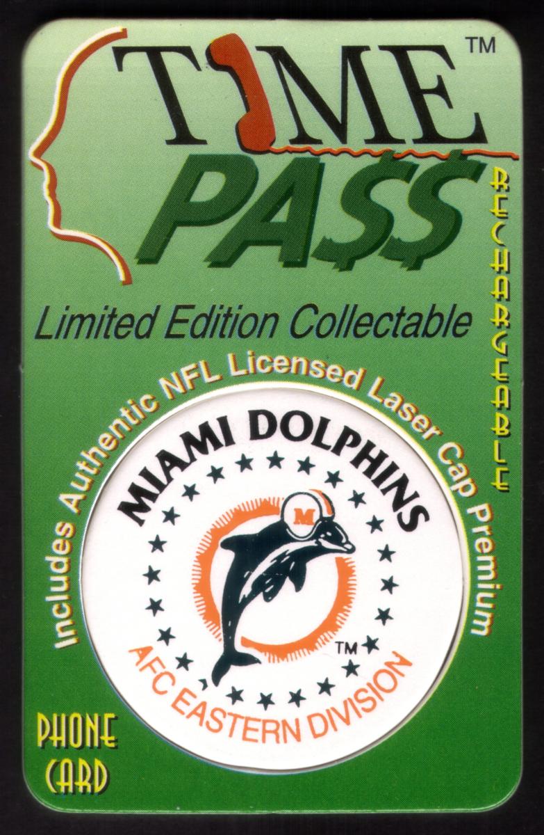 At the top center of the card, the NFL shield logo is displayed, signifying official NFL licensing. Along the bottom edge, the text “Time Pass with Miami Dolphins Football” is printed clearly in white letters on a teal banner, emphasizing the card’s connection to the team and its football heritage. The card also includes the words “NFL Licensed Laser Cap” and mentions “Access Telecom” and “IGN,” reflecting official partnerships or branding associated with the collectible.