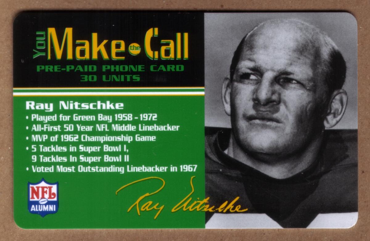 This collectible prepaid phone card features Ray Nitschke, a legendary middle linebacker for the Green Bay Packers. The card displays a black and white portrait of Ray Nitschke on the right side, showing him in a close-up headshot with a serious expression. The left side of the card contains text highlighting his football career achievements on a green and black background with yellow and green accents.