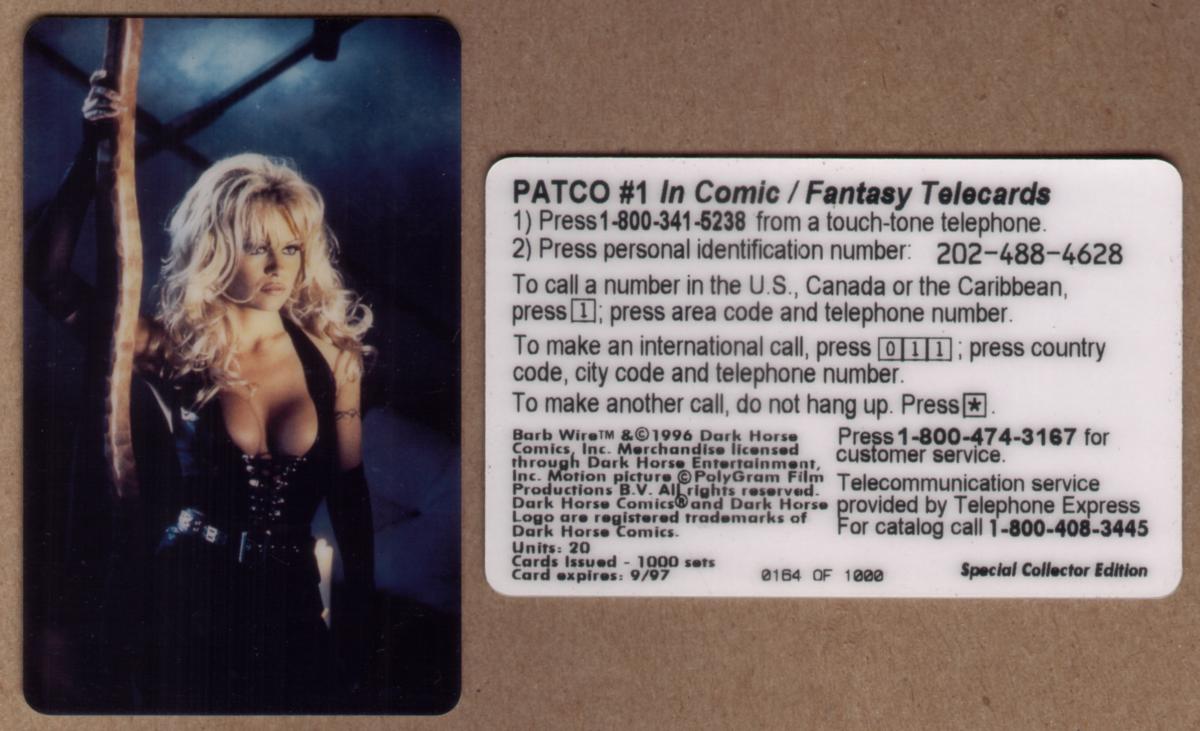 The card includes logos for Dark Horse Comics and Public Access 20u, linking it directly to the "Barb Wire" movie licensing. The branding "PATCO" is present, indicating the issuing entity. The design emphasizes Pamela Anderson’s status as a famous Hollywood actress during the film’s release, with clear references tying the collectible to movies, celebrities, and entertainment themes.