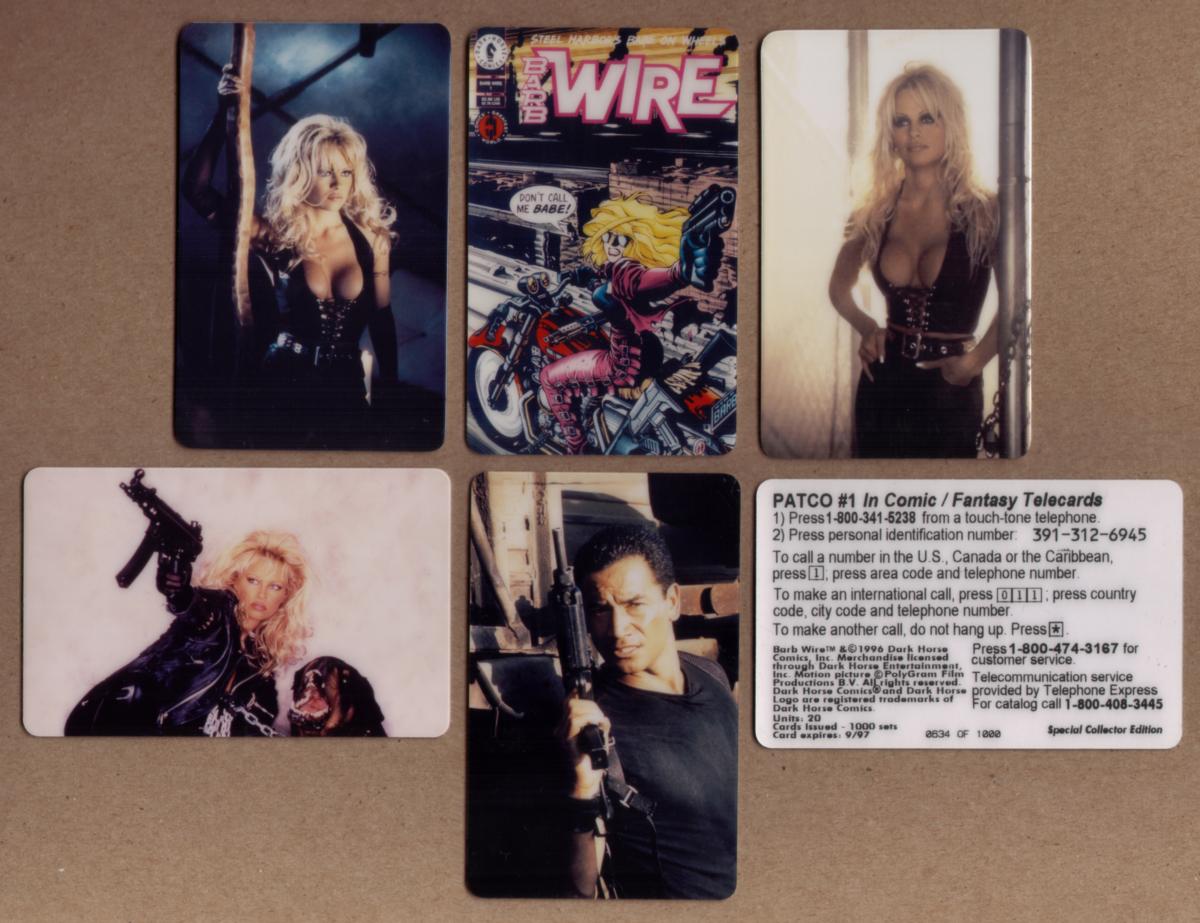 This collectible set features five phone cards themed around the 1996 action-adventure film "Barb Wire," starring Pamela Anderson. Each card showcases Pamela Anderson in various promotional images from the movie, highlighting her role as the tough, leather-clad bounty hunter named Barb Wire. The imagery emphasizes the dark, gritty Hollywood entertainment style connected to the film, which is based on the Dark Horse Comics series.