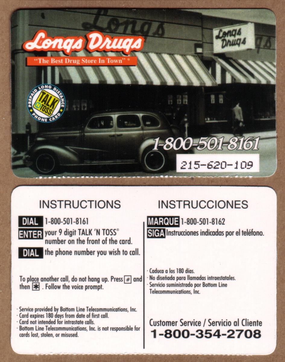 The card includes the "Talk-n-Toss" logo indicating it is a prepaid long-distance phone card. The phone number "1-800-501-8161" is printed clearly on the card along with the code "215-620-109." The card is visually framed with a brown border, highlighting the vintage feel of the photograph.