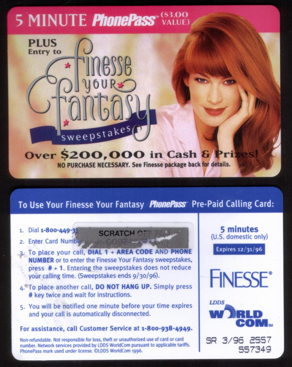 Additional text on the card includes “5m,” indicating the card’s value or calling time, and “LDDS WorldCom,” identifying the issuing telecommunications company. The overall presentation combines branding elements, promotional copy, and corporate identification, linked together to promote the 1996 Finesse Your Fantasy hair care products sweepstakes.