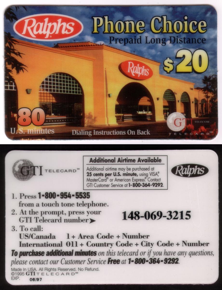 The card’s prepaid value is $20, designated for long distance calling use. Text on the card clearly states its purpose and promotional nature, highlighting that it is a prepaid card for long distance telephone service. The overall design centers on the Ralphs store image, accompanied by company and service details in readable fonts.