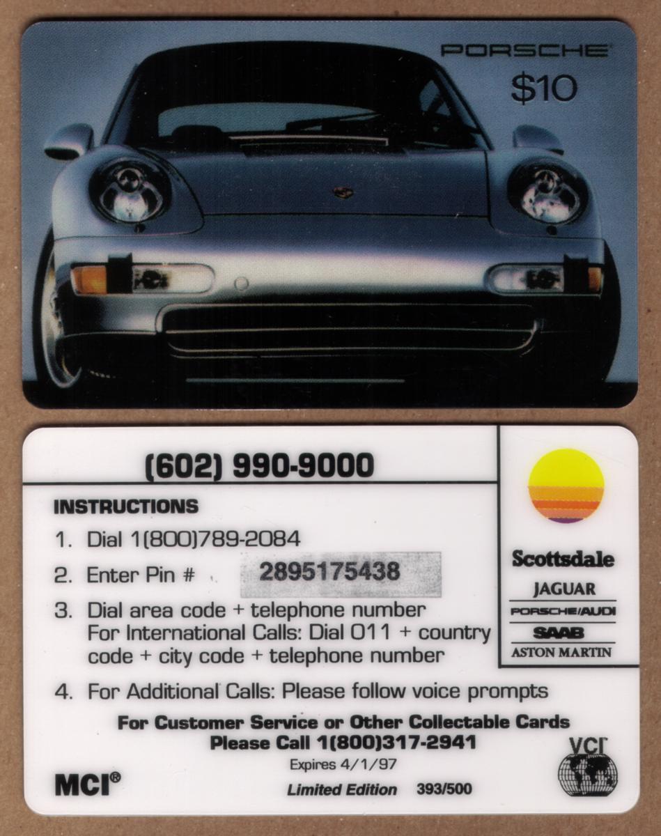 The card was issued by MCI Communications, as indicated by the small logo in the lower left corner. The overall design centers around premium sports and luxury cars, with particular focus on Porsche and the Scottsdale dealership for Jaguar, Aston Martin, and Saab used vehicle promotions. The card’s clean layout and automotive branding make it a collectible item for enthusiasts of high-end automobile marques.