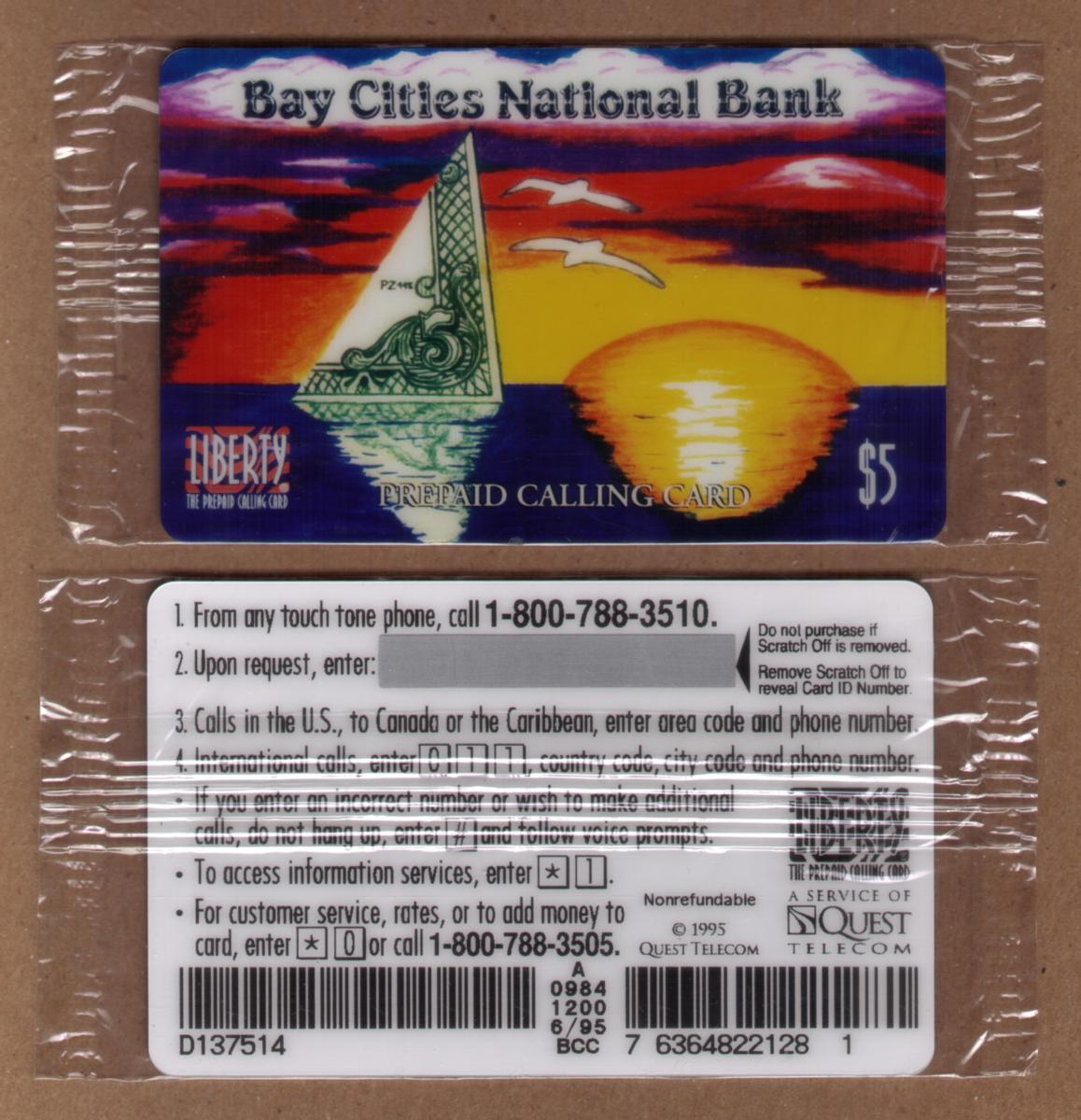 This collectible chip card features the Bay Cities National Bank and showcases an artistic ocean scene with a sailboat design. The ocean design includes waves and a single sailboat, emphasizing a nautical theme. The card’s color palette includes shades of blue and green, capturing the essence of a calm sea under a clear sky. The card carries the text "Bay Cities National Bank" prominently, identifying the financial institution associated with it.