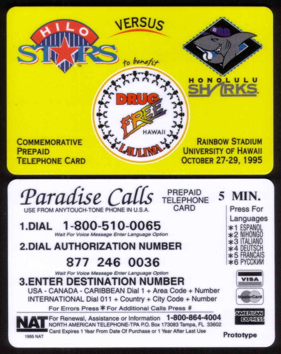 This collectible phone card commemorates the October 1995 baseball game between the Hilo Stars and the Honolulu Sharks held at Rainbow Stadium in Hawaii. The card prominently features the logos of both teams: the Hilo Stars and the Honolulu Sharks. The background includes a colorful rainbow design, reinforcing the connection to Rainbow Stadium. The card promotes the "Drug Free Hawaii" initiative and includes the word "Laulima," which means cooperation or unity in Hawaiian, emphasizing community and teamwork.