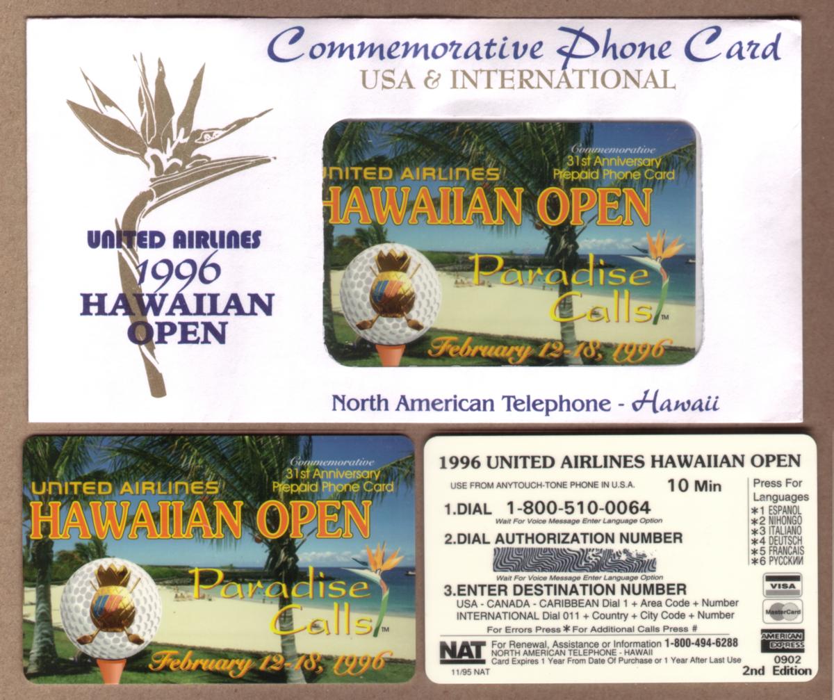 Overall, the phone card blends elements of sport, nature, and location to celebrate the Hawaiian Open Golf's milestone anniversary with clear references to its sponsor, United Airlines, and the issuing company, North American Tel. The design is colorful and thematic, aimed at collectors and golf enthusiasts alike.