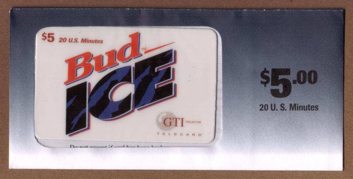 Printed on the card are the names "GTI Telecom, Inc." and "Anheuser-Busch," identifying the telecommunications company and the brewing company involved. The design incorporates a stylized depiction of a beer can or bottle wrapped in ice or condensation to reinforce the cold, refreshing quality of the beverage. Additionally, "Bud Ice" is visibly written, connecting the promotional card to this specific Budweiser product variant.
