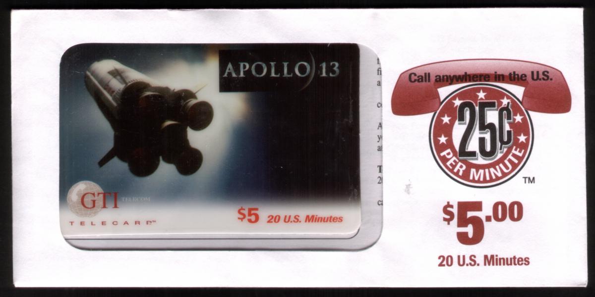 Produced by GTI Telecom, Inc., this phone card serves as a commemorative piece linked to NASA photographs and cinematic representations of space missions. The focus on the booster rocket connects to space crafts and rockets used in manned lunar endeavors, including the Apollo missions. The visuals on the front of the card contain imagery consistent with aviation and astronautical engineering in the context of Hollywood cinema entertainment.